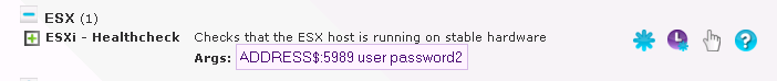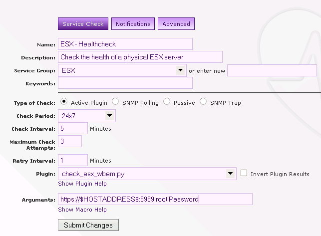 Now we have confirmed the script is running we need to add it to Opsview. The first step here is to reload Opsview to pickup the new plugin. Once complete goto Configuration -> Service Checks and Create New Service Check. Setup your check in a similar way to the image below (remember to substitute “root” and “Password” with a valid username and password to login to your ESX host